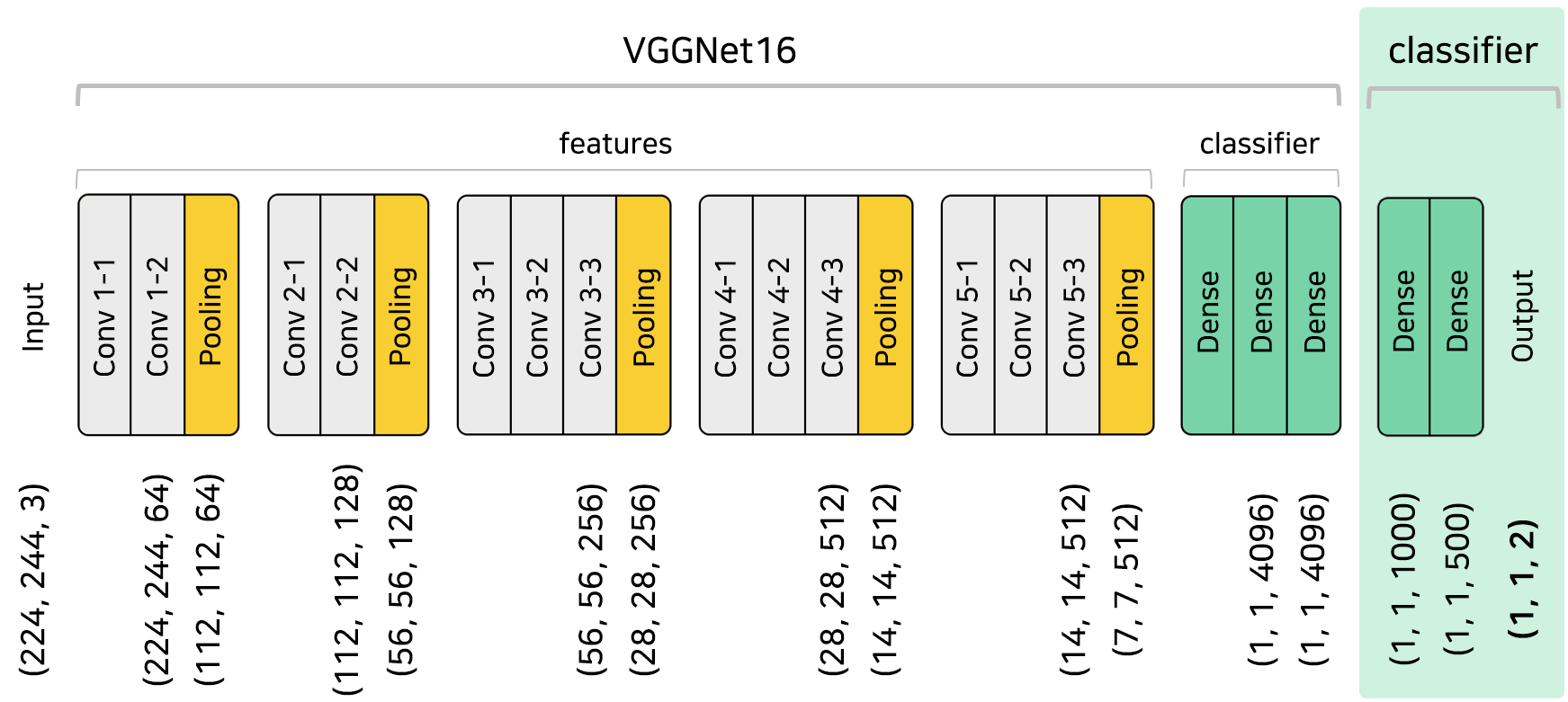 구조가 이렇기때문에, input으로 들어가는 이미지의 크기를 (224, 244)로 맞춰줘야한다. 그리고 RGB로 입력 채널은 3개.