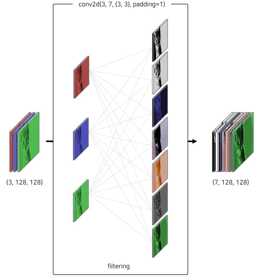 만약 in_channels가 3이라면, 3채널인 RGB가 각각 들어간다는 뜻이고, out_channels 만큼의 필터링 결과를 뽑아낸다.