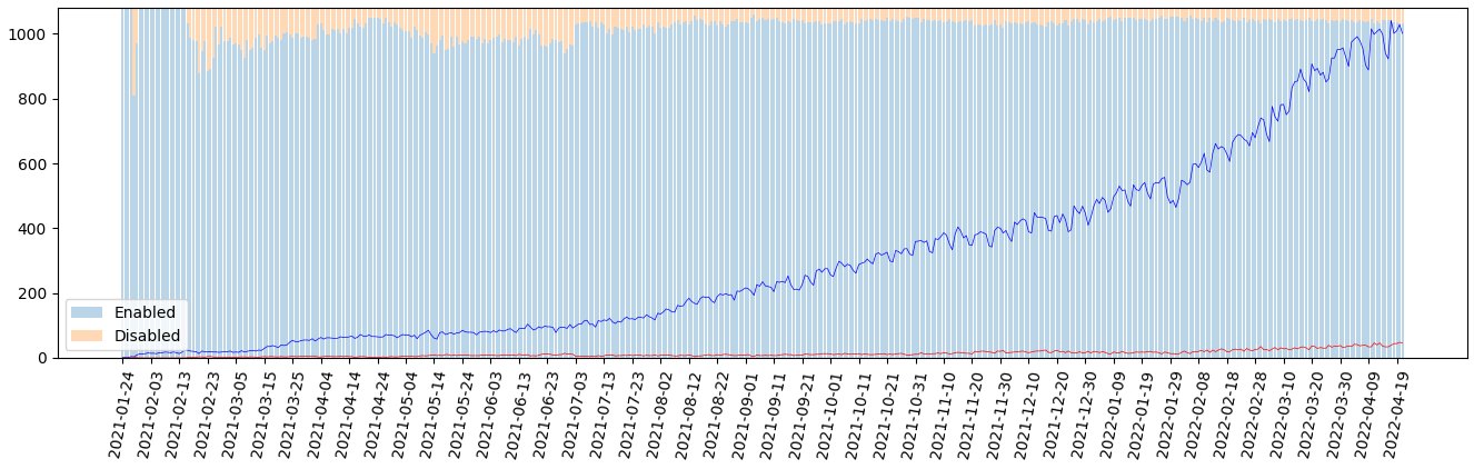 Line 그래프로 보기에는 비활성화의 수가 계속 증가하고 있어서 데이터를 뽑아서 비율도 표시해봤는데, 무려 95%의 유저분들이 꾸준히 사용해주고 계신다.