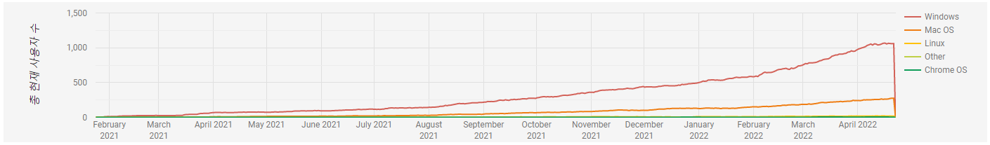 오늘 운영체제별 사용자 수의 통계를 볼 수 있다는 것에 한번 놀랐고, MacOS 사용자 비율에 다시 놀랐다. 2022년 4월 기준으로 Windows가 1000명, MacOS가 250명이다. Linux 사용자도 20명 정도 있는데 신기하다.