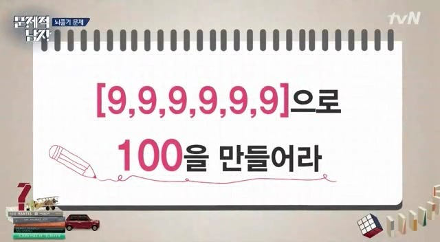 [코딩으로 풀어보기] 문제적 남자 4화 - (9, 9, 9, 9, 9, 9)으로 100 만들기 본문