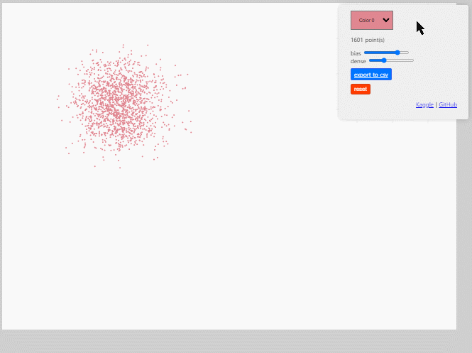 캔버스와 마우스 이벤트를 이용해서 그림판처럼 데이터를 그릴 수 있게 했고, csv로 (x 좌표, y좌표, 색상 번호)를 추출할 수 있도록 간단하게 만들었다.