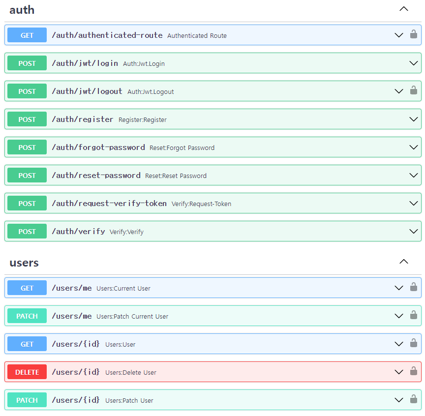 FastAPI Users 튜토리얼에서 사용하는 모델을 별로 바꾼 것이 없다. 라우터를 묶어서 한번에 추가해주면 Docs에서 아래와 같은 엔드포인트들을 확인할 수 있다.