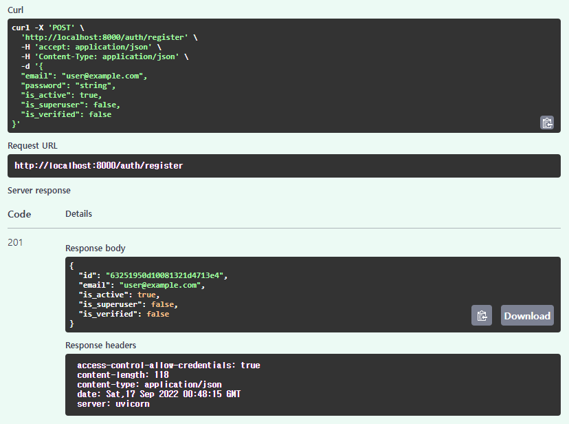 - /auth/register : 유저를 등록한다. email과 password가 적힌 JSON 형태를 body에 담아 요청한다. 성공 여부를 응답하고, DB 설정까지 마쳤다면 연결된 DB에 계정이 추가되는 것까지 확인할 수 있다.