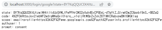컴포넌트가 로드되면, aixos를 사용해서 그대로 /auth/google/callback 에 받았던 GET 파라미터를 묶어서 그대로 전달하다시피 요청하는데, aixos 연결 대신에 구글로부터 넘어온 GET 파라미터를 출력해보면 아래와 같다.