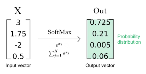 이제 softmax 를 통과한 input vector는 전체 확률의 합이 1.0 으로 계산된다.