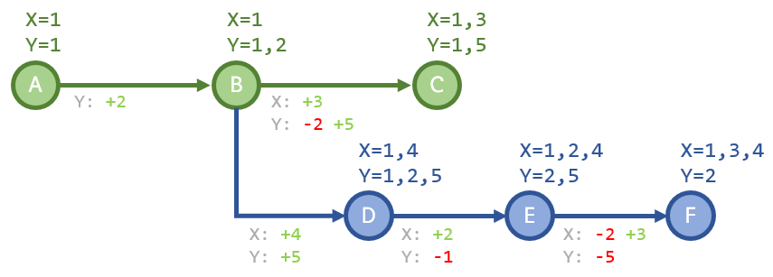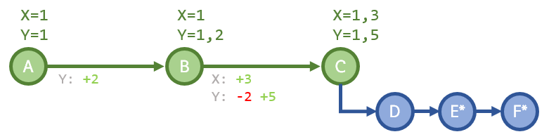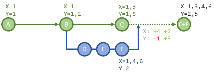 커밋 C는 파일 X에는 3을 추가하고 파일 Y은 2를 제거하고 5를 추가하는 내용이다.