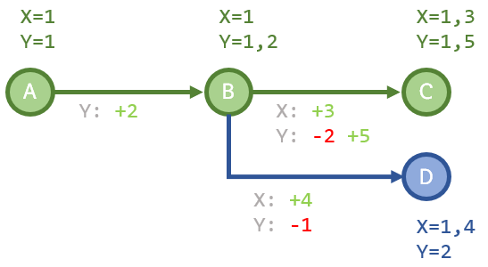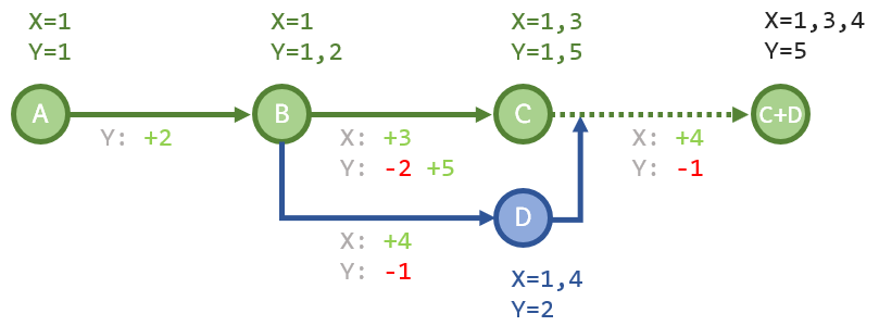 커밋 D는 파일 X에는 4를 추가하고 파일 Y은 1을 제거하는 내용이다.