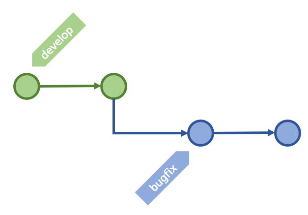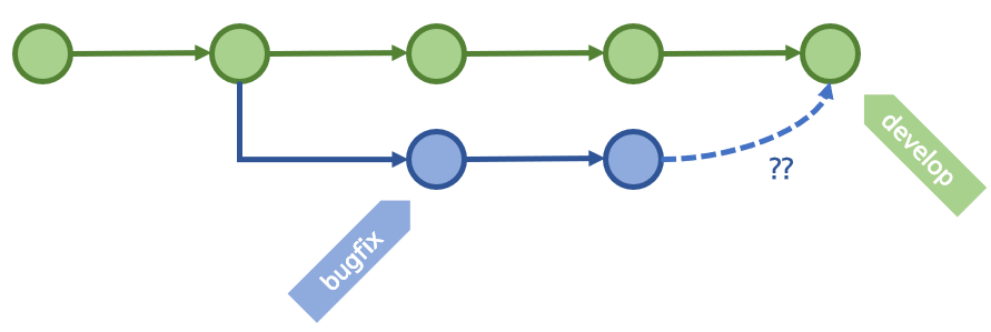 이제 bugfix 브랜치에서 작업을 마치고 다시 develop 브랜치에도 변경한 코드를 적용하고 싶은데, develop 브랜치는 다른 이유로 브랜치 분기 이후로 커밋이 추가된 상황이다.