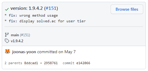 실제로 커밋에 기록된 정보를 보면, 합치면서 사용한 2개의 부모를 가지고 있다.