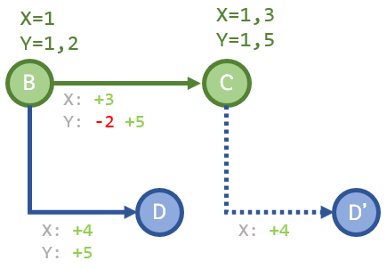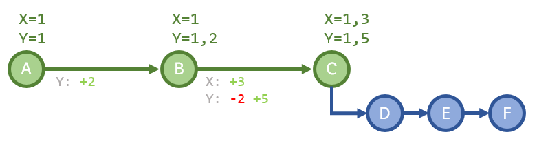 커밋 C는 파일 X에는 3을 추가하고 파일 Y은 2를 제거하고 5를 추가하는 내용이다.