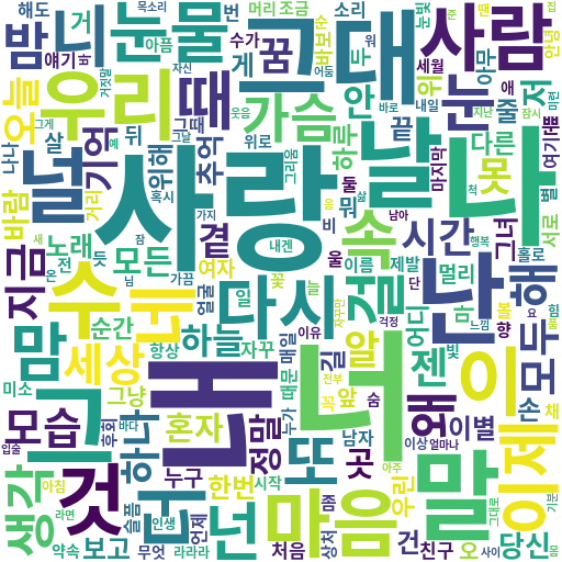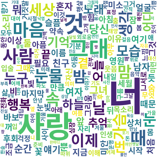 명사로는 나/너/사랑/그/그대/우리/마음/다시/사람 순으로 많았고, '거'는 "그럴거야"와 같은 문장에서 많이 등장한 걸로 보인다.