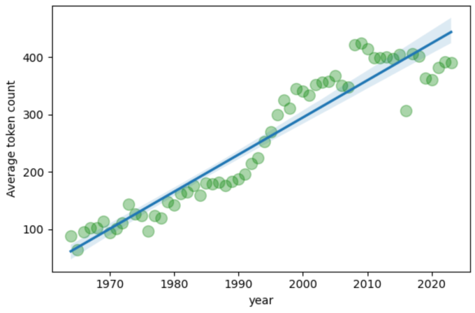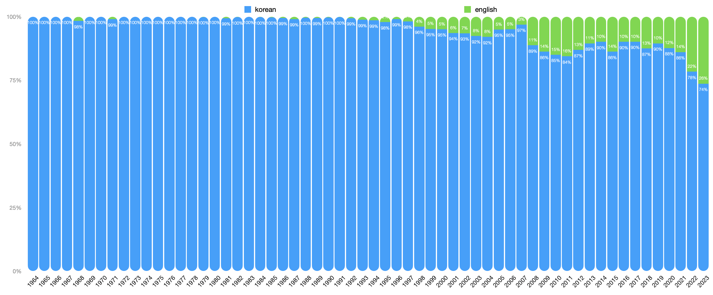 마침 1964년부터 2023년까지 60년의 데이터가 쌓였고, 결론부터 말하자면 영어 비중은 많아졌다.