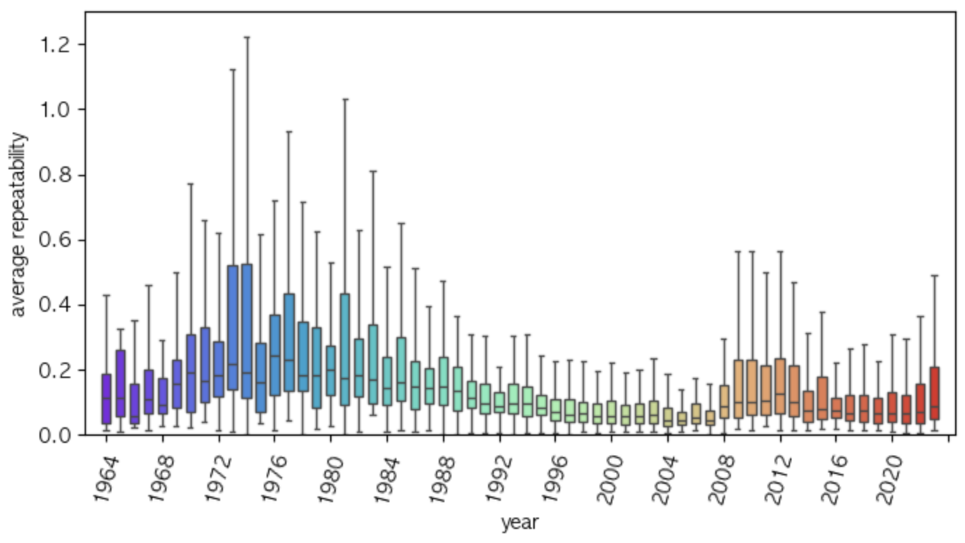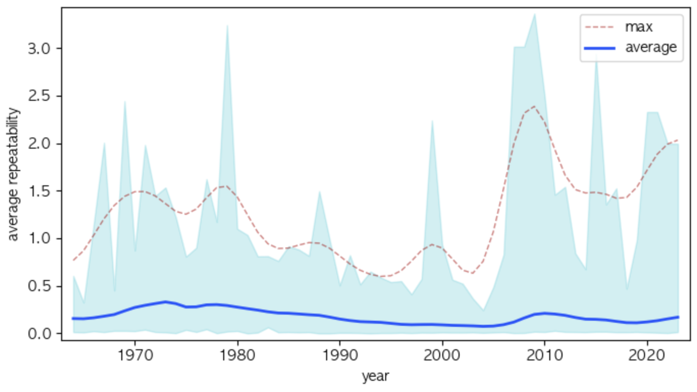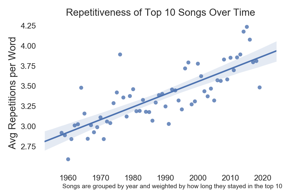 평균 가사 반복도가 가장 높았던 해는 1973년으로 0.37 이다. 참고로 2009년의 평균 가사 반복도는 0.222 로 16번째로 높다.