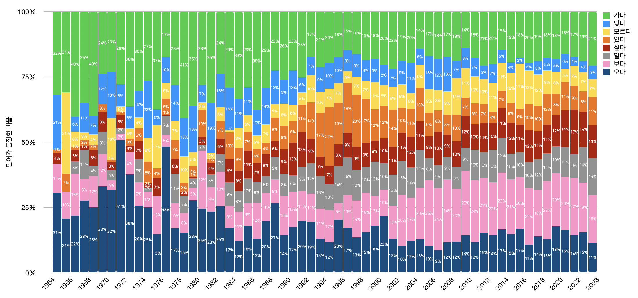과거에는 고향으로 가는 가사가 많았어서 '가다'가 많이 쓰였지만 지금은 그렇지 않다. '모르다'의 비율은 2016년에 17% 로 가장 높았고, 1990년 이후로 '잊다'의 비율이 가장 높은 해는 2006~2008년으로 13% 이다.