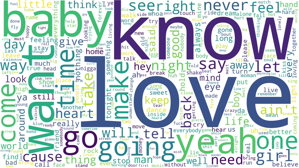 아래는 2020년도 Billboard Hot 100 Top 10 노래 가사로 만든 워드 클라우드인데, 국내 가요에서 쓰이는 것과 크게 다르지 않다.