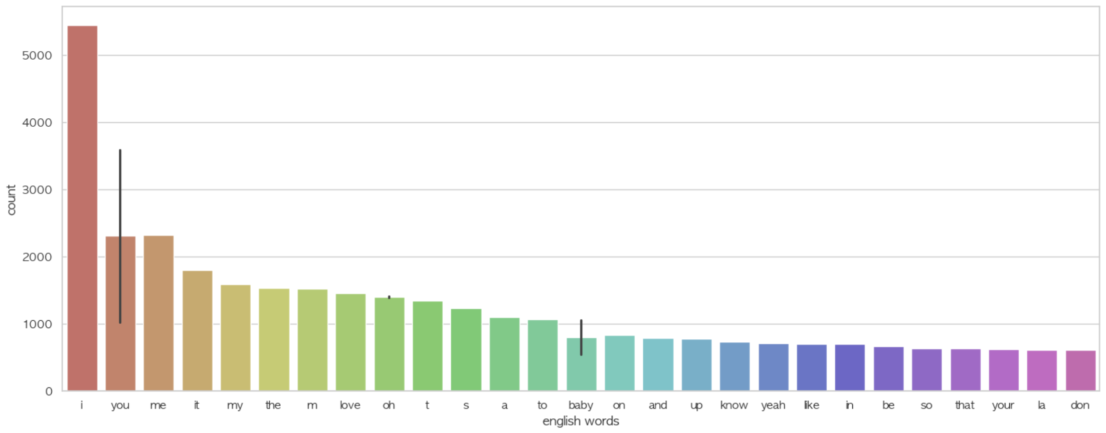 시대가 지날수록 단어의 수가 많아지는 걸로 보아 노래에 사용되는 어휘가 다양해진 것을 알 수 있다.