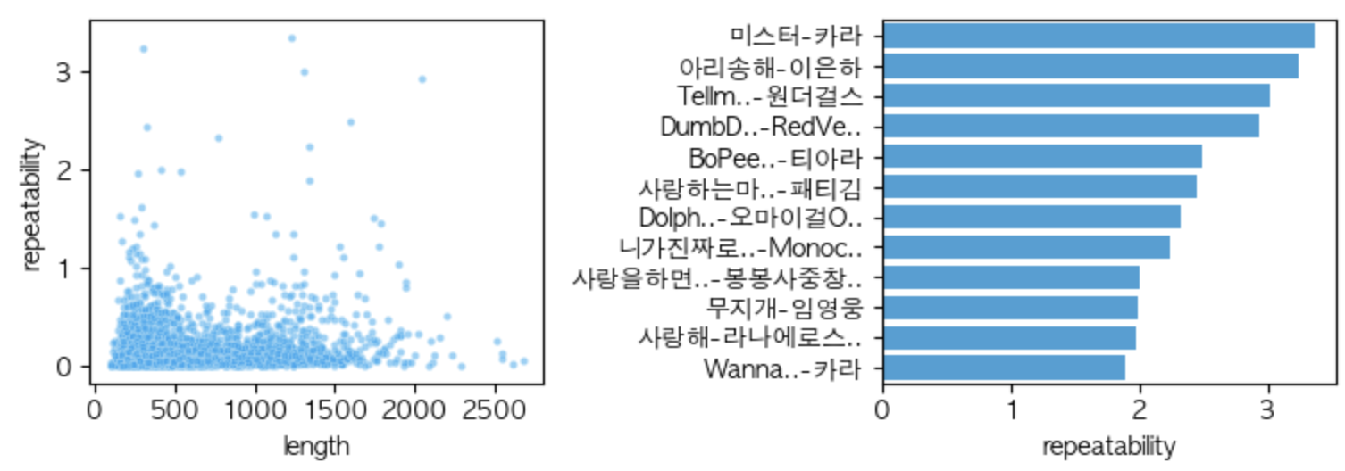위 그래프에서 등장하는 노래는 반복도가 가장 높게 측정된 12개의 노래이다.