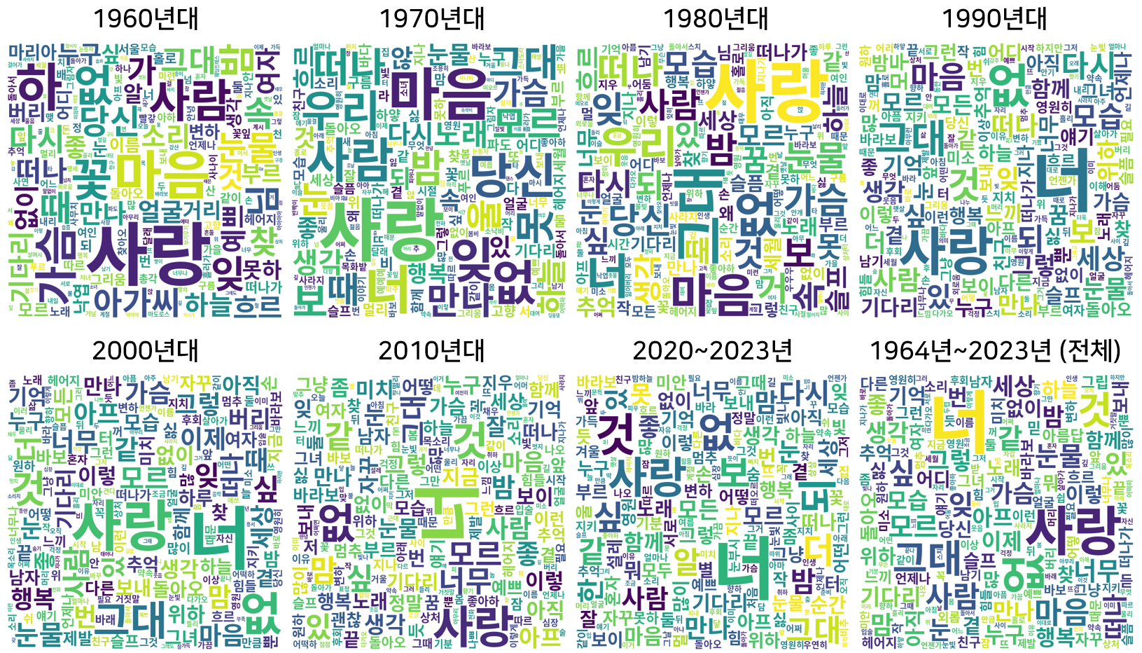 "너", "사랑", 그리고 "잊다", "없다" 와 같은 키워드는 전 시대를 관통하는 듯 모든 시대에서 크게 보인다.