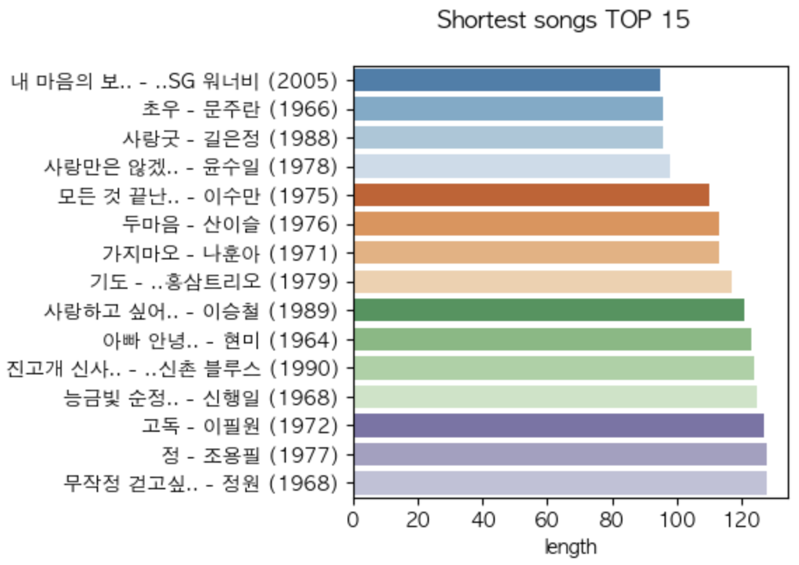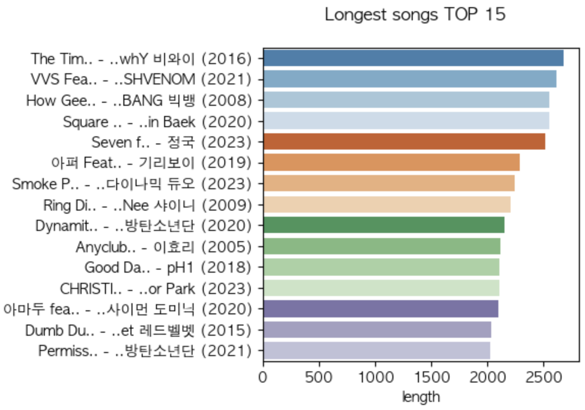 가사의 길이를 단어(공백) 단위로 셀 지 글자 수로 셀 지 고민했는데, 둘 다 확인해도 차트가 크게 다르지는 않아서 글자 수로 정렬했다.