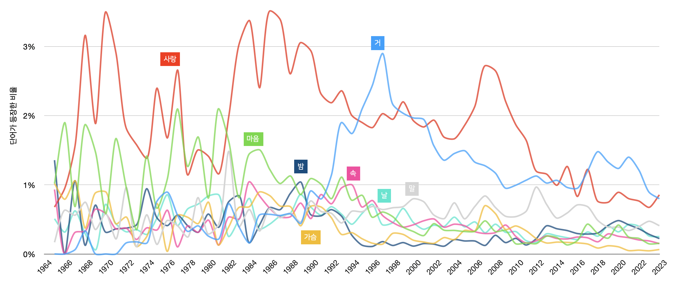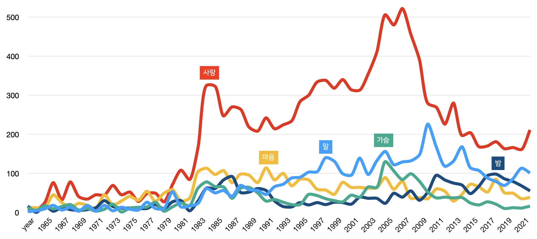 품사 구분이 애매하긴 하지만 가장 많이 쓰인 단어는 역시 '사랑'이고, 그 사용 비중이 가장 높았던 해는 1986년(3.4%) 이다.