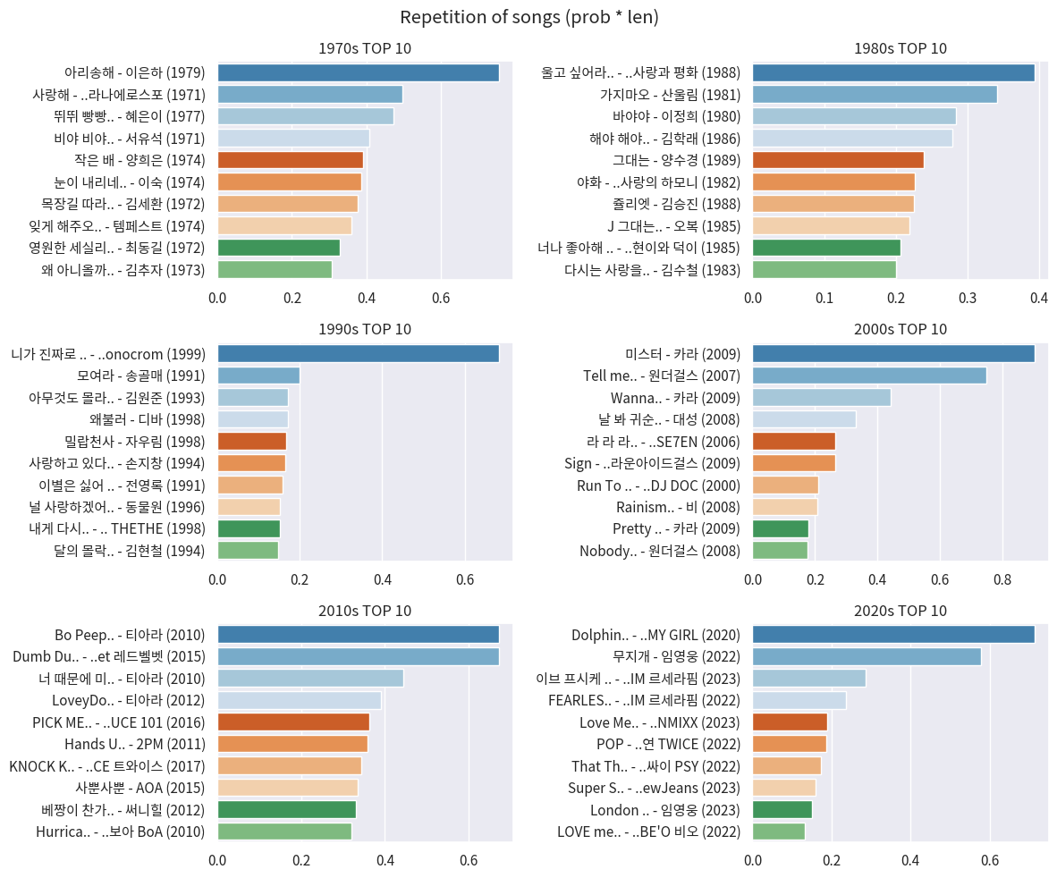TF-IDF 값의 평균이 가장 높은 노래는 사랑의 모닥불 - 이용복 (1974) 인데, 그 외에도 대부분이 1970~80년대 노래이다.