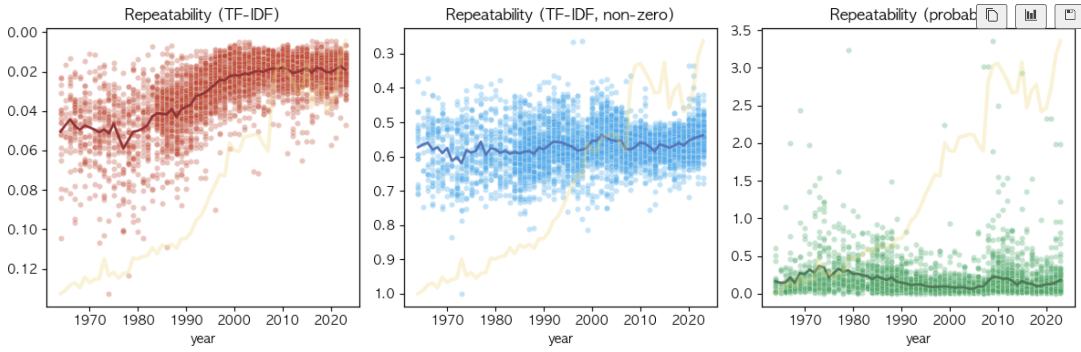 연도별로 각 노래들의 평균 TF-IDF 값을 계산했을 때 결과는 아래와 같다.