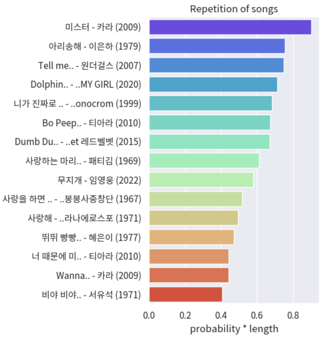 이렇게 계산했더니 가사 반복도 TOP 15 목록이 아래와 같이 나왔다.