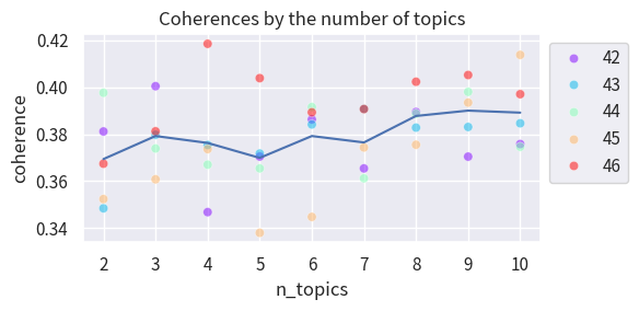 적절한 주제(클러스터) 수를 잡기 위해서 5개의 랜덤 시드마다 결과를 확인해보고 coherence 평균값을 구해서, 9개의 주제로 분류하기로 결정했다.