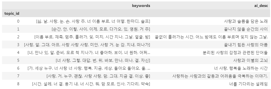 각 주제마다 중요도가 높은 상위 10개의 단어를 뽑아서, GPT 같은 LLM 모델로 주제의 문장을 완성해보면 어떨까했다.