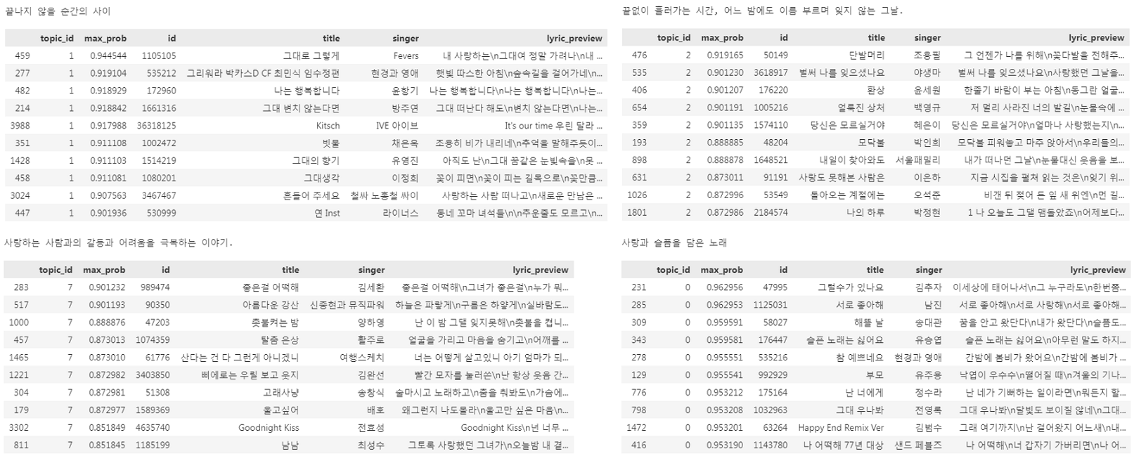 앞서 진행했던 K-Means 보다는 주제 내 각 단어의 중요도 가중치를 볼 수 있어서 좋았지만, 여전히 플레이리스트 제목처럼 한 문장으로 정의하기는 어려웠다.