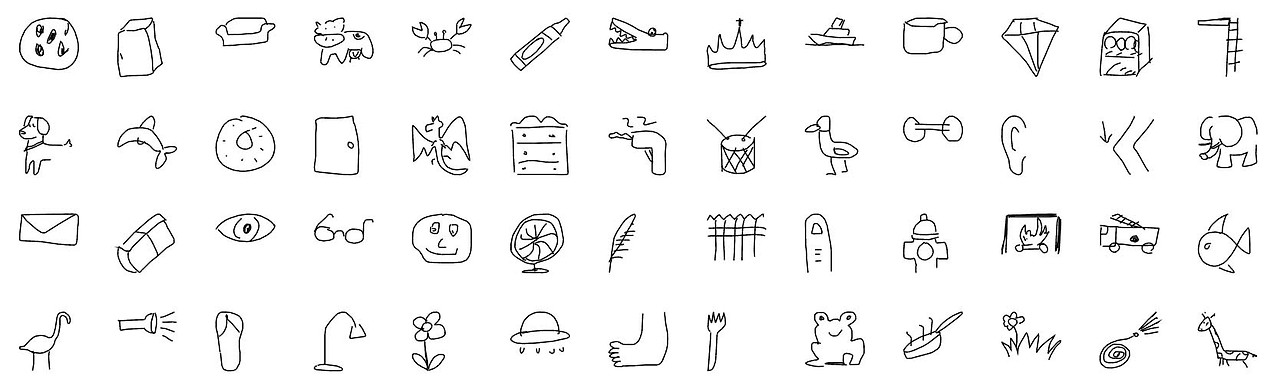먼저 Quick, Draw! 는 구글에서 위와 같은 낙서 데이터 셋을 학습하여 345개의 주제 중 하나를 그리면 머신 러닝 모델을 통해 정답을 맞추는 게임이다. 그리고 이 데이터셋을 오픈소스로 공유했다.
