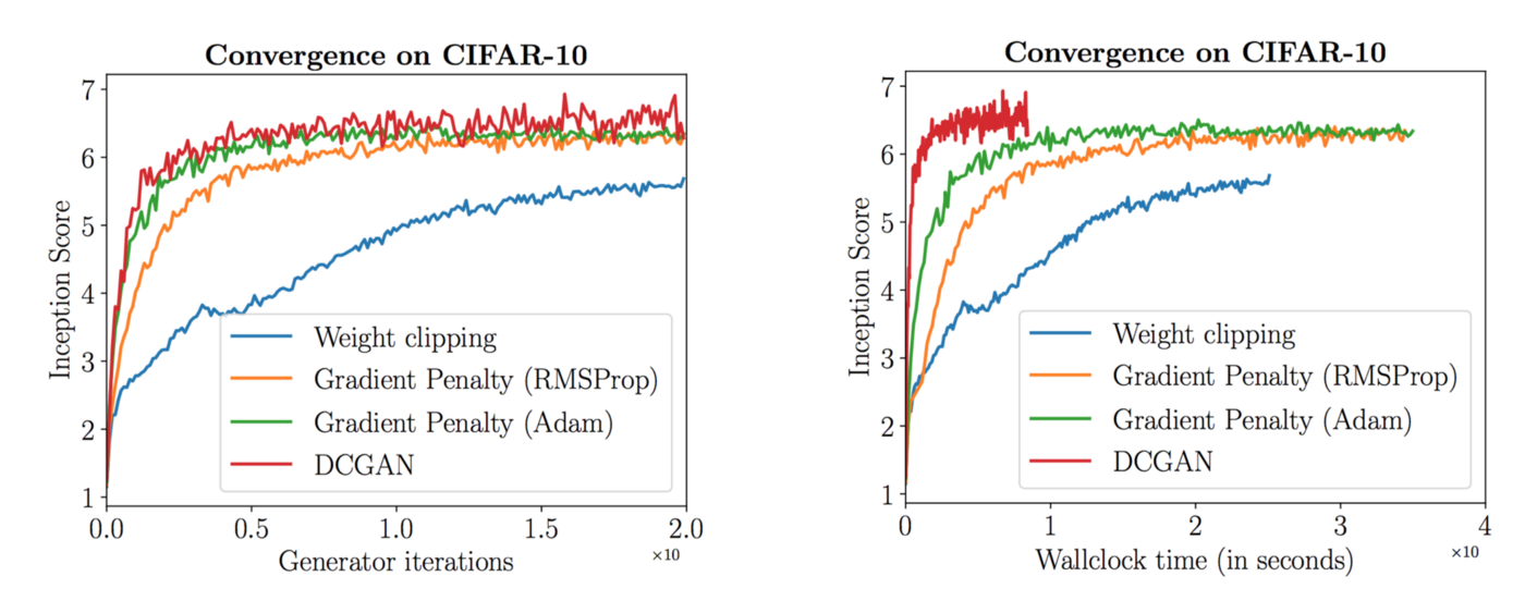 그리고 WGAN-GP 버전은 모멘텀 기반의 optimizer인 Adam을 사용해도 문제 없이 동작한다. (아래에 Figure 3 참고)