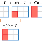 링크: https://www.acmicpc.net/problem/14852 문제 타일 시리즈 중 하나인데, 2×N 크기의 벽을 2×1, 1×2, 1×1 크기의 타일로 채우는 경우의 수를 구하는 문제이다. 먼저 왼쪽부터 타일을 채워가면서 생기는 모양에 따라 부분 문제를 만들어나간다. 아래와 같은 모양을 각각 f(n),g(n)이라고 정의해보자. g(n)은 첫 번째 열 중에서 한 칸만 채워진 경우이다. 두 모양이 채워질 수 있는 Base case를 이렇게 정의하자. f(0)은 모든 타일을 채웠다는 뜻으로 1개로 센다. g(0)은 불가능한 모양이므로 0이다. 먼저 g(n)은 아래와 같이 세 가지 모양으로 전개될 수 있다. 첫 번째 열의 빈칸에 1×1짜리 타일을 하나 채우면 ..